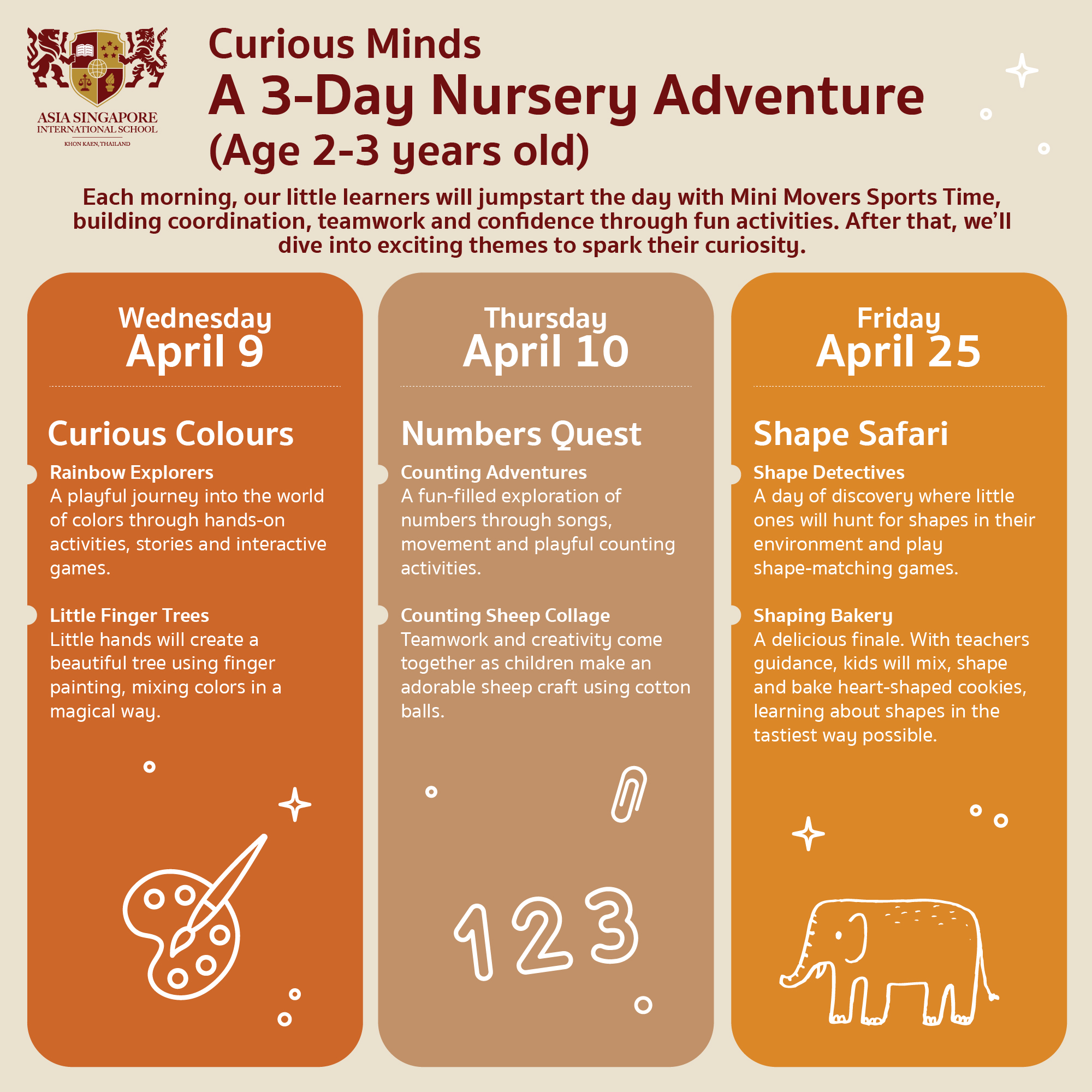 👶 Nursery (2–3 years): April 9, 10, 25