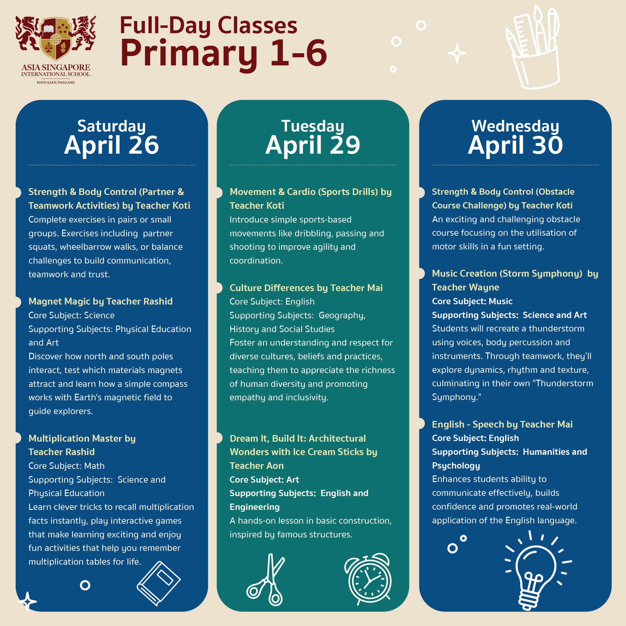 เดือนเมษายนนี้ ให้ลูกของคุณได้ สัมผัสการเรียนรู้แบบบูรณาการที่ ASIS ด้วยแนวทางการสอนที่ผสาน ศิลปะและวิทยาศาสตร์ของการเรียนรู้ ความคิดสร้างสรรค์ และ นวัตกรรม ทำให้ทุกบทเรียนสนุกและมีความหมาย ✨ ตั้งแต่หัวข้อ การเดินทางข้ามเวลา ไปจนถึง STEAM Innovation เพราะทุกวันคือการผจญภัยครั้งใหม่ที่น่าตื่นเต้น 🌍🔬🎨